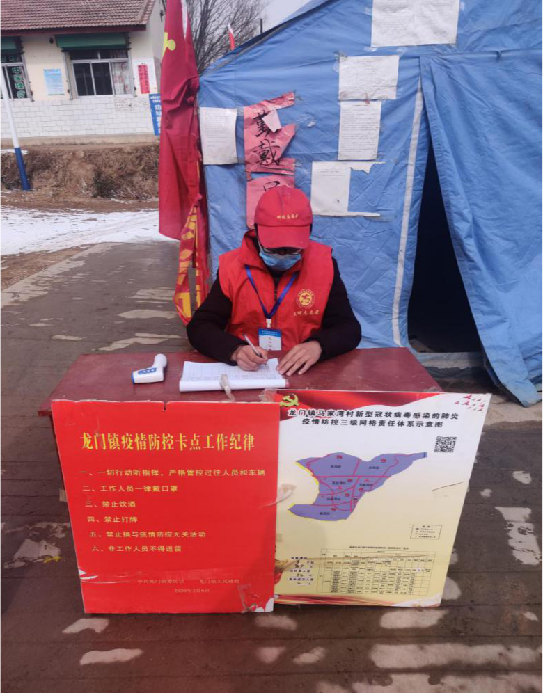 家住甘肃敦煌的王文秀是99905新莆京2016级旅游管理专升本班的学生,同时也是一名入党积极分子。她主动向当地党支部报到,志愿参加防疫工作,成为了一名“抗疫先锋”,她说:“作为中华儿女,理所应当并肩努力,共克时艰。作为一名入党积极分子,更加应该主动投身一线。”王秀文每天的工作是值守检测点负责出人员登记、体温测量,为外地返乡人员建立档案,发放联防联控宣传材料。北方的冬天格外寒冷,但在疫情防控一线的工作岗位上,她始终没有退缩。