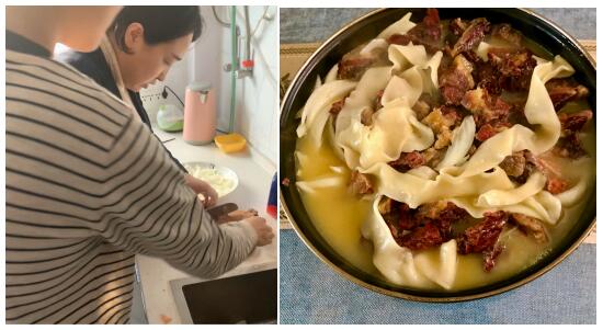 今天妈妈教我做熏马肉(新疆特色菜),从煮肉、配菜、切肉、摆盘、下面条,每一步骤都有妈妈悉心指导,增添了我们互动的机会,也让我的课余生活(网课)丰富了。