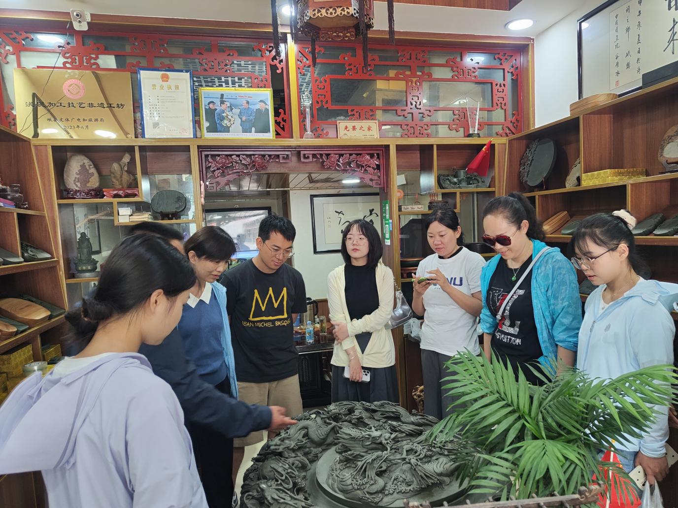 在观摩学习后,实践团与场馆负责人与非遗传承人就“非遗的保护传承与开发、非遗与旅游融合发展现状、非遗传承过程中对于形成中华民族共同体意识所发挥的文化基因和精神纽带作用的具体体现”等一系列问题进行了访谈。对当地非遗艺术的起源、发展历程、传承现状和经营模式等方面进行了系统的了解。非遗传承人用实际行动助力非遗传承,让更多地人了解非遗文化,让更多地人关注非遗的保护与传承,让非遗在铸牢中华民族共同体意识中发挥更大的力量,为文旅融合和乡村振兴赋能助力。