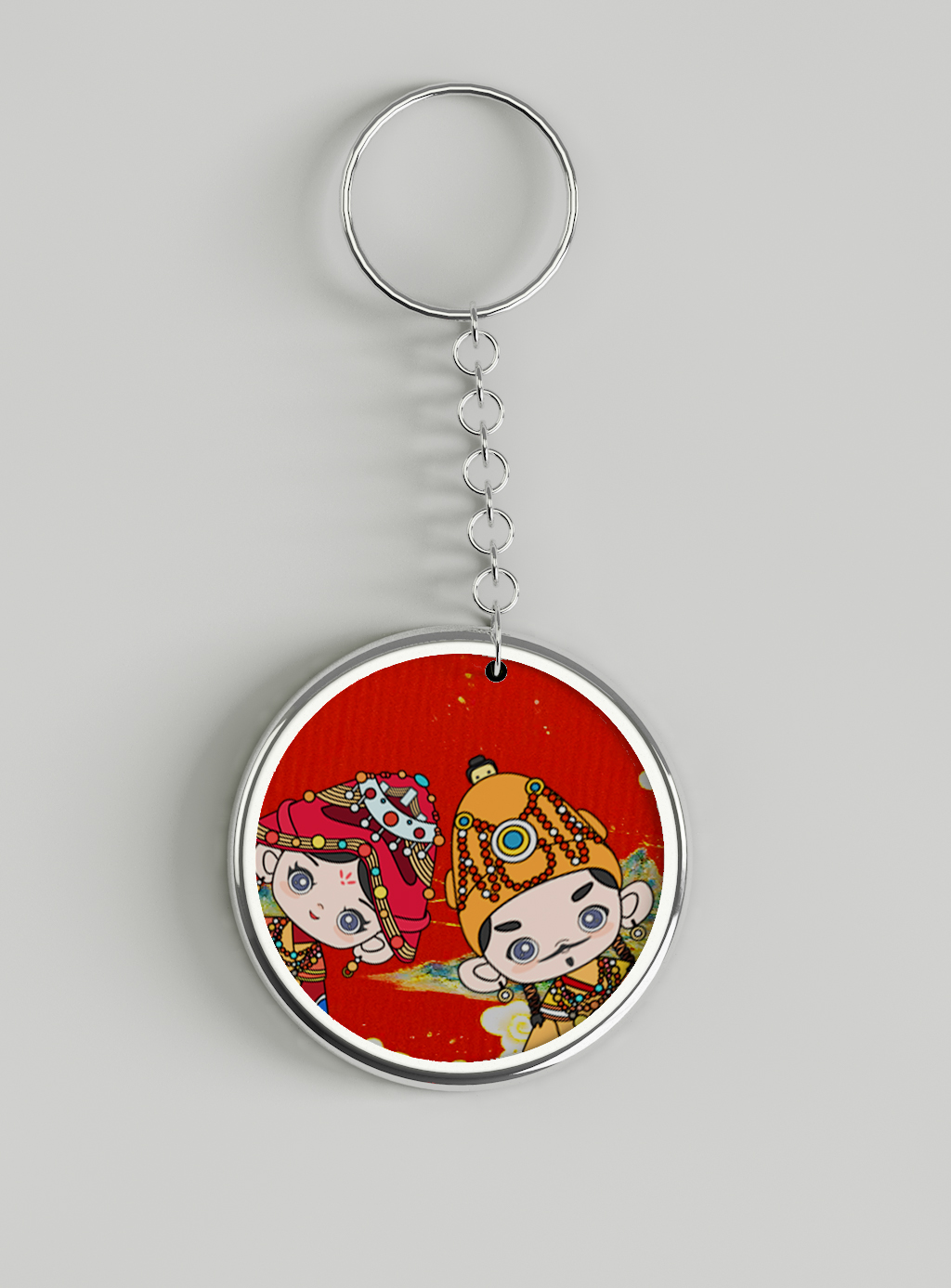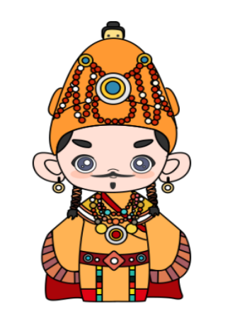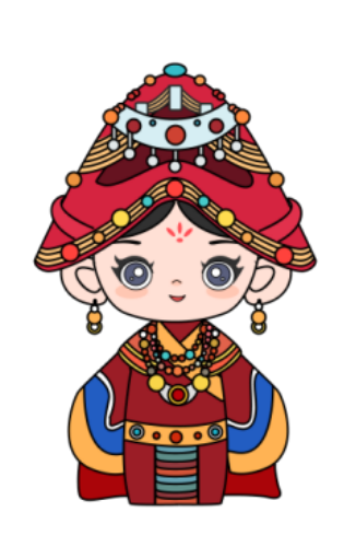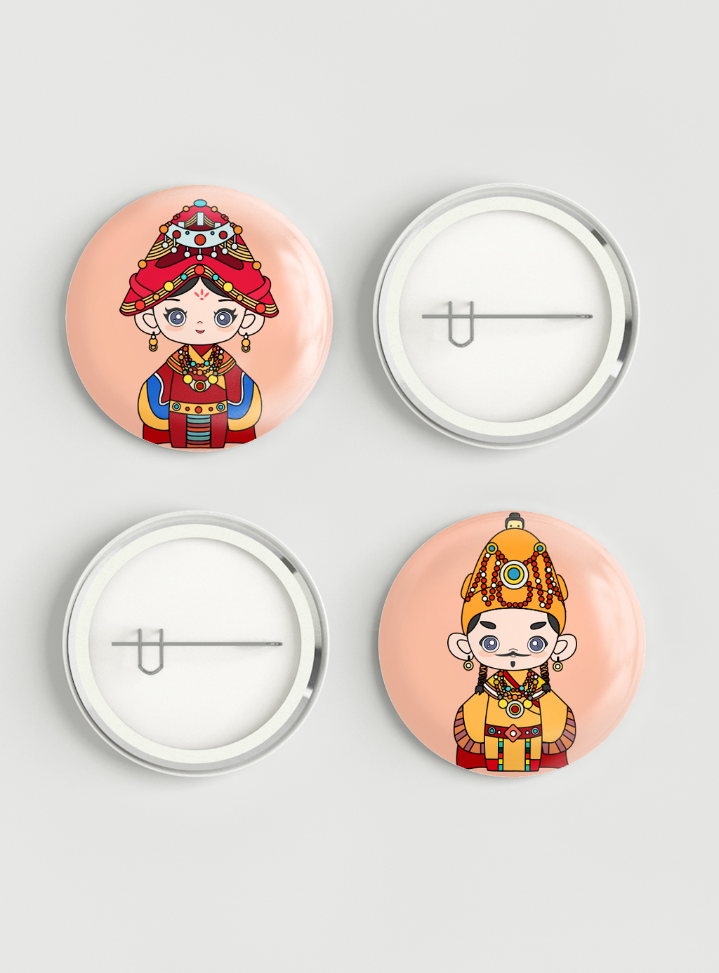 IP形象的设计以红、黄为主色调,寓意着文成公主进藏一事为唐蕃古道带来了经济与文化的繁荣发展。设计的主导思想以“传播文化、促进经济、保护生态”为主:众多细节突显藏族文化、唐蕃古道文化(例如双方脖子上佩戴的瑟瑟石、藏族服饰的斜衣领、松赞干布的小辫子等)。除此之外,团队成员基于该IP形象还设计出了胸针、帆布袋、钥匙扣等文创产品。