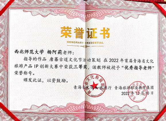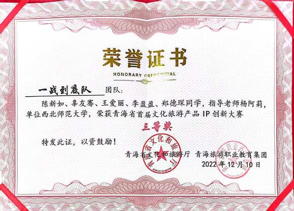 在激烈的角逐后,88805j新莆京参赛团队脱颖而出,荣获“优秀组织单位”奖,99905新莆京教师杨阿莉教授荣获“优秀指导教师”荣誉称号,她所带领的硕士研究生陈新如等同学组成的“一战到底”团队,凭借丰富的活动设计与独特的创意,获得“青海省首届文化旅游产品IP创新大赛三等奖”。