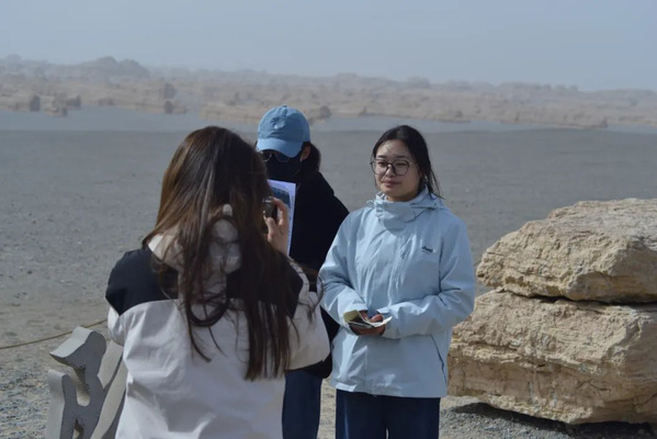 在敦煌雅丹地质公园,形态各异的雅丹地貌令学生叹为观止。刘旺娥、张丽霞、王钰等同学结合所学知识,现场讲解了雅丹地貌的形成过程、地质构造等,并分享了相关的文化故事。