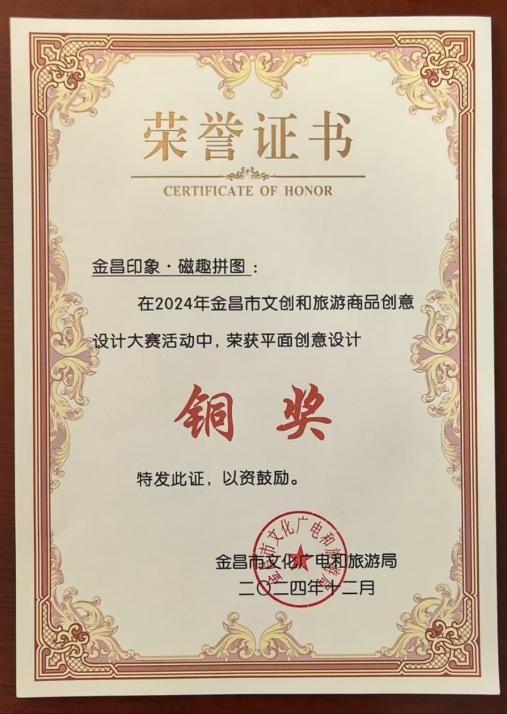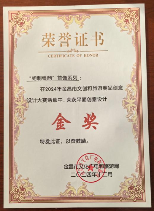 在激烈的竞争中,99905新莆京学子充分发挥专业优势,深入挖掘金昌市丰富的非遗文化、乡村民俗、历史文化等元素,并将其巧妙融入设计作品中,在众多参赛作品中脱颖而出,得到了评委们的高度认可。作品《“韧刺镍韵”首饰系列》荣获平面创意设计金奖,《金昌印象·磁趣拼图》荣获铜奖。