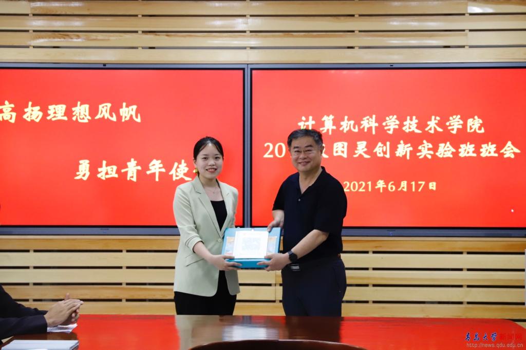 图灵创新实验班班长梅杰从思想建设、学风建设、创新竞赛、社会实践、志愿服务、团建活动等六个方面介绍了一年来创新实验班取得的各项成绩;曹阳、赵新鹏、王文涵三位同学围绕自己在学习、竞赛、科研、社会服务、公益活动等方面的经历和收获分别作了交流发言;姜旭阳同学代表全班同学向校长赠送了班级纪念册和学院文创产品。