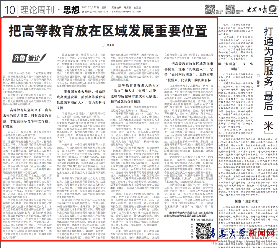 新闻网讯 今日,校党委书记胡金焱在《大众日报》发表理论文章“把高等教育放在区域发展重要位置”。文章指出,在我国进入新发展阶段的大背景下,高等教育对于高质量发展的重要作用愈发凸显,做大做强高等教育应成为国家和地区发展的一种持续的战略选择。