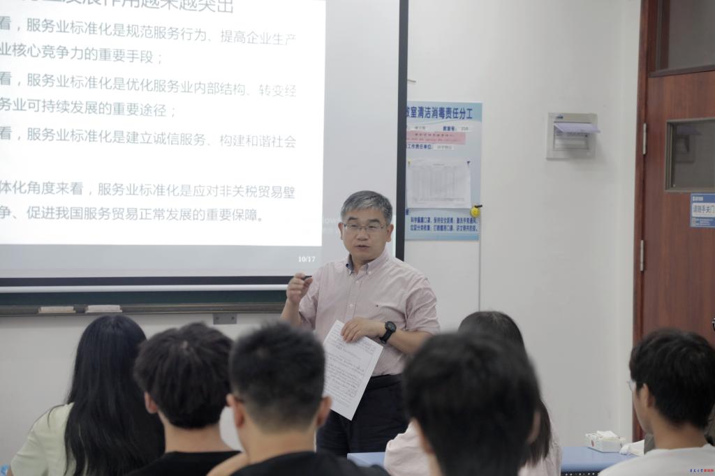校党委书记胡金焱来到博文楼216教室,和同学们一起听取质量与标准化学院孙慧波老师的《服务标准化》课程。在课间休息时,胡金焱与任课老师和同学亲切交流。他对任课教师在教学准备和课堂组织方面的表现予以肯定。并对课程改进方面提出了四点建议:一是注重课程内容组织,增加课程知识量和信息量、丰富课堂教学内容;二是倡导互动交流方式,注重研究型教学,既要扩展知识面,又要探讨学理性;三是注重课程过程化管理和考核,考虑增加课后研究、分组讨论、课堂提问等环节,通过过程化考核,调动学生积极性和主动性,提高课堂效率;四是加强课程网站建设,完善教案、教材、参考书目、习题、课程视频等课程资源,有效支撑学生自主学习、课堂教学和教学改革。胡金焱勉励同学们专心读书、奋发图强,响应国家号召,努力成为中国特色社会主义合格的建设者和可靠接班人。