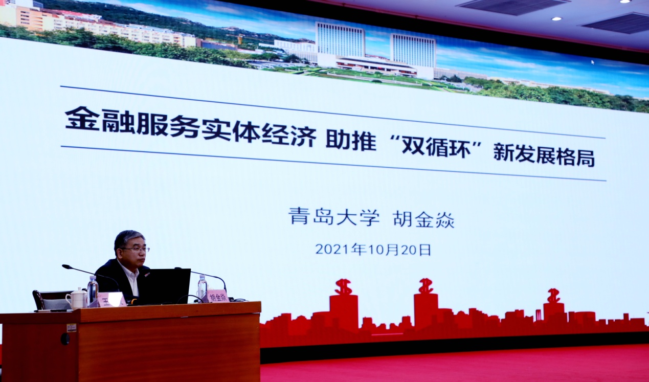 签约仪式结束后,胡金焱为临沂大学管理干部和教师代表作了《金融服务实体经济发展,助推“双循环”新发展格局》专题报告。他从对外开放与沿海外向型经济发展战略的历史背景、“双循环”新发展格局与经济高质量发展的时代背景,深入浅出地阐述了金融支持实体经济的历史演进及新阶段的机遇与挑战,深刻论述了金融服务经济“双循环”新发展格局的路径与举措。