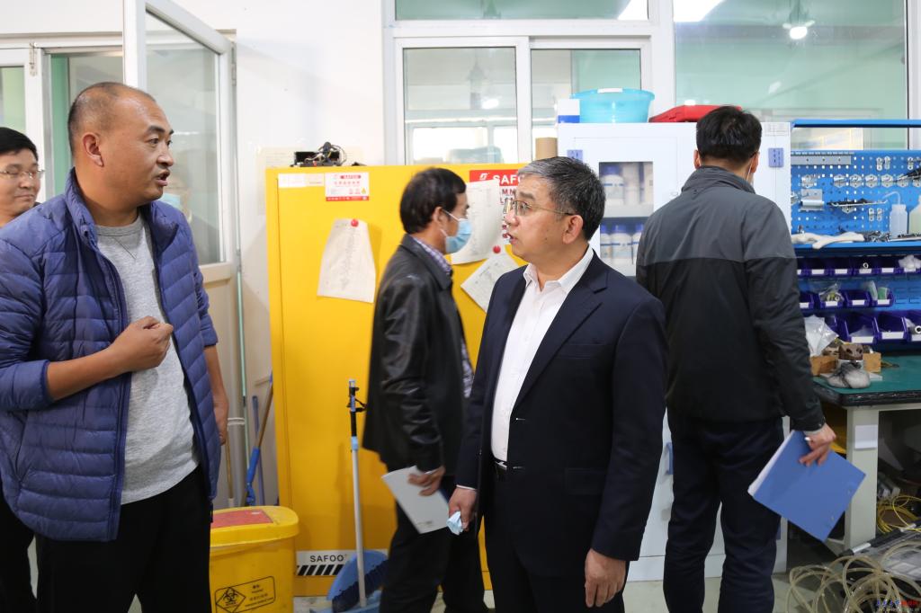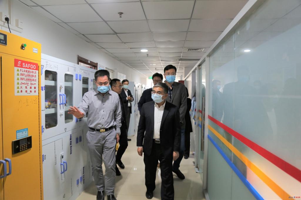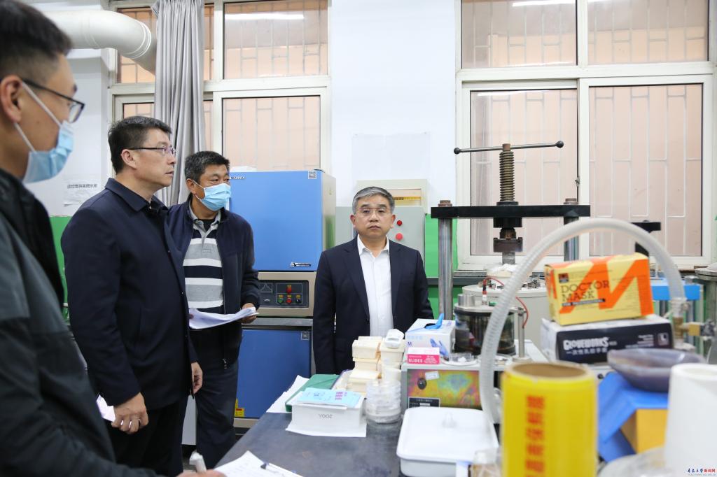 胡金焱一行重点检查了医学部药学院的药化实验室、生药与天然药化实验室,物理科学学院的博观楼科研实验室,生物多糖纤维成形与生态纺织国家重点实验室,以及生物医用材料与工程研究院、高性能固体电解质与固态锂电池工程研究中心、能源与环境材料研究院、非织造材料与产业用纺织品创新研究院、电动汽车智能化动力集成技术国家地方联合工程技术中心等科研机构的实验室。