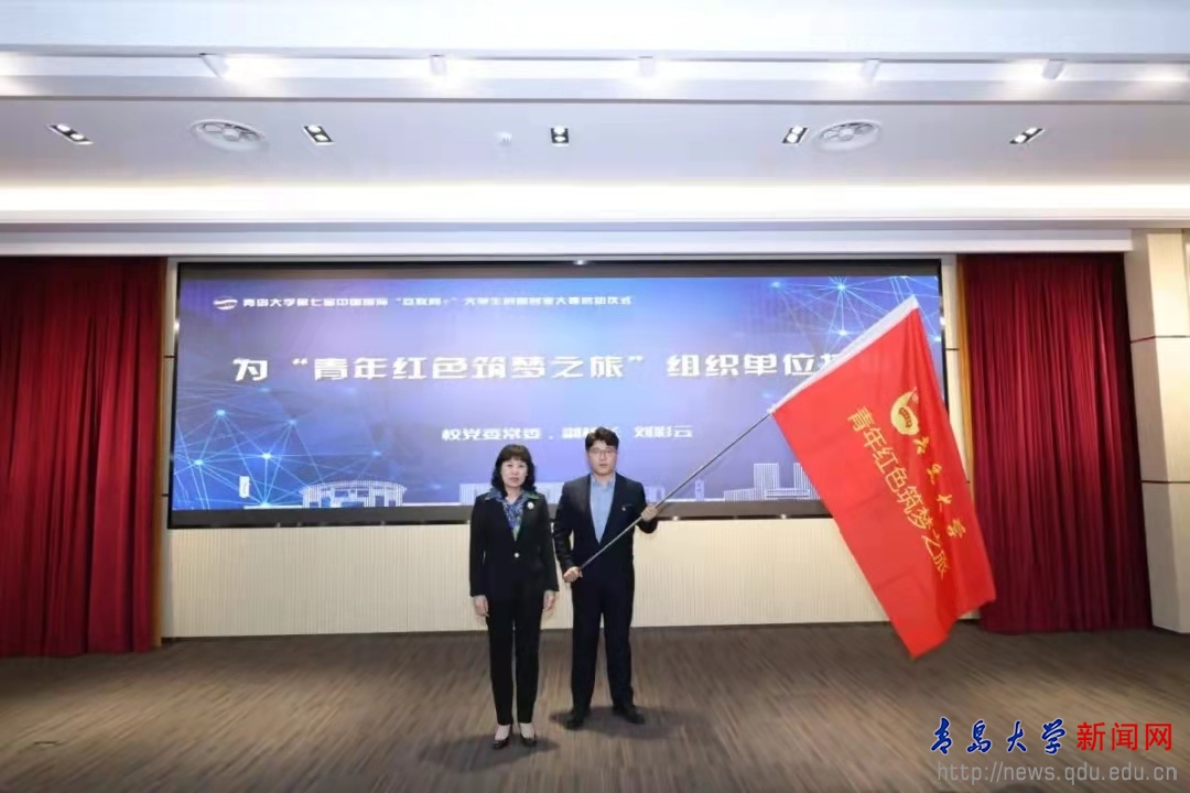 仪式上,刘彩云为本届“青年红色筑梦之旅”组织单位授旗,标志着鸭脖2021年“青年红色筑梦之旅”正式启动。