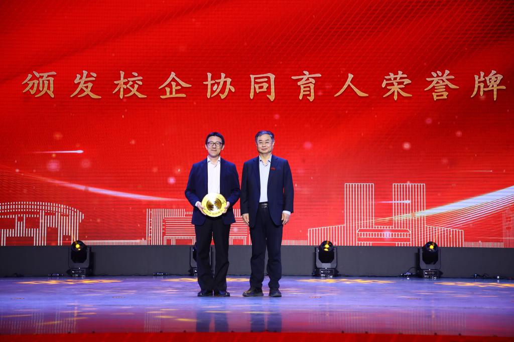 校党委书记胡金焱为特别邀请的7名获奖学子的家长赠送“校家协同育人荣誉牌”,校长夏东伟为青岛啤酒集团有限公司颁发“校企协同育人荣誉牌”。
