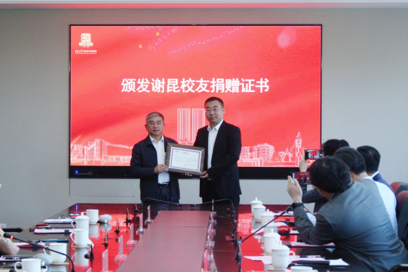 谢昆介绍了自己大学毕业后工作情况以及合资成立启迪青业新能源有限公司的成长经历,同时表达了对母校、学院及老师们深厚感情。谢昆表示,计划连续10年捐赠母校500万元(50万/年),助力母校发展。作为校友,他希望自己的微薄之力能促进和帮助学校的创新发展,也期待能跟校友办、基金会、各个学院能有长期的广泛的合作,希望在合并办学30周年庆典之际,有更多的校友知校、爱校、荣校,鸭脖以校友为荣,校友以鸭脖为荣。