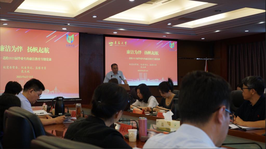 会上,范玉斌以《廉洁为伴,扬帆起航》为题从使命担当、奋斗成才和法纪底线三个方面作廉洁教育专题党课,并为学生代表赠送廉洁教育书籍。