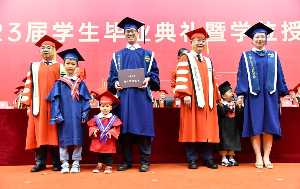 胡金焱、夏东伟为博士学位获得者颁发学位证书、扶正流苏并合影留念。