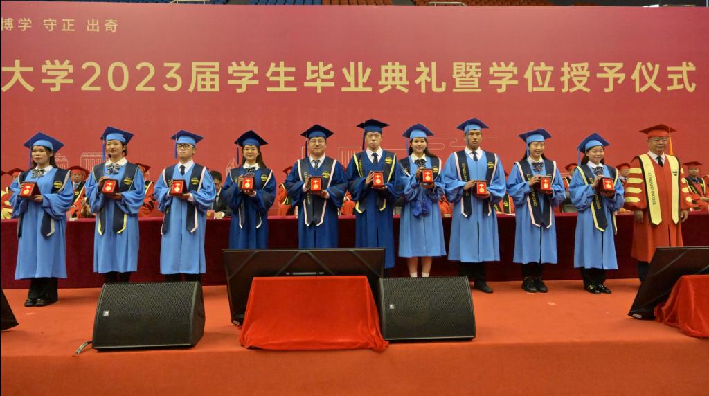 校领导、各学院(部)院(部)长、相关职能部门负责人以及知名教授代表为硕士、学士学位获得者颁发学位证书、扶正流苏并合影留念。