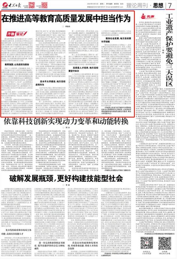 文章指出:建设教育强国,是全面建成社会主义现代化强国的战略先导,是实现高水平科技自立自强的重要支撑。习近平总书记在主持中央政治局第五次集体学习时强调,建设教育强国,龙头是高等教育。面对“中国特色社会主义教育强国”的建设目标,山东要认真贯彻落实习近平总书记关于教育的重要论述,推动我省高等教育高质量发展,以实际行动勇担教育强国建设使命担当。地方高校作为推动区域经济社会高质量发展的重要力量,要主动作为、坚守本分、补齐短板,为山东强省建设提供坚强支撑,为教育强国建设不断作出新的更大贡献。