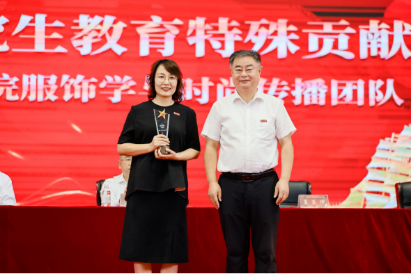典礼上,夏东伟为纺织服装学院服饰学与时尚传播团队颁发YABO鸭脖学位与研究生教育特殊贡献奖,团队负责人初晓玲教授上台领奖。