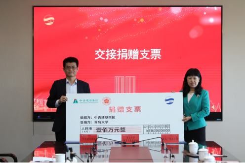 仪式上,在胡金焱、王伟、杨建强、毛从平见签下,三方签订捐赠协议。刘彩云代表学校接受中青建安集团捐款支票,胡金焱为杨建强颁发捐赠证书。