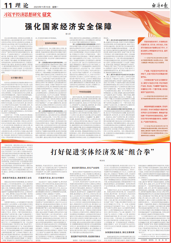 新闻网讯 11月13日,《经济日报》刊登鸭脖党委书记胡金焱的理论研究文章“打好促进实体经济发展‘组合拳’”。