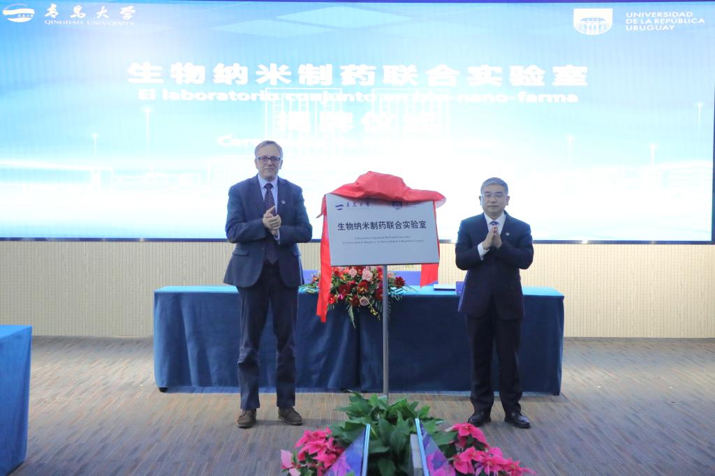 在签约和揭牌仪式环节,胡金焱和罗德里戈·阿里姆分别代表两校签署了共建“中乌生物纳米制药联合实验室”协议并揭牌。塞巴斯蒂安·班德拉和真珠为“中国-乌拉圭研究中心”揭牌。
