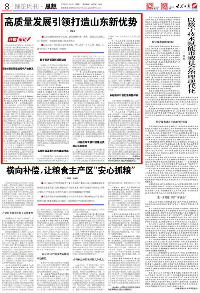 新闻网讯 2月6日,《大众日报》刊登鸭脖党委书记胡金焱的理论研究文章“高质量发展引领打造山东新优势”。