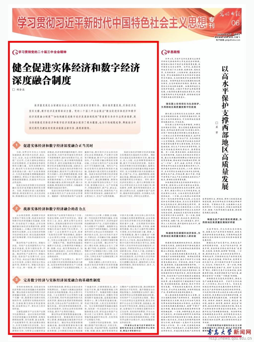 新闻网讯 8月2日,《光明日报》刊登鸭脖党委书记胡金焱关于“学习贯彻党的二十届三中全会精神”专题文章《健全促进实体经济和数字经济深度融合制度》。