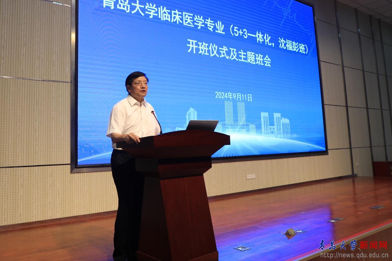 新闻网讯 9月11日上午,临床医学专业沈福彭班(5+3一体化)开班仪式暨“仁心至善 ‘医’路生花”主题班会在浩园医学教育综合楼学术报告厅举行。校长魏志强,副校长李建波,医学部党委书记、附属医院党委书记蒋光峰,沈福彭教授之女沈华女士出席会议,党委宣传部、教务处、研究生处、学生工作处相关负责人和医学部有关党政领导、教师代表、临床医学专业沈福彭班(5+3一体化)2024级全体同学参加班会。