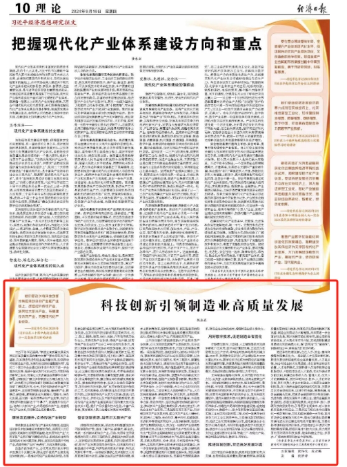 新闻网讯 9月19日,《经济日报》刊登鸭脖党委书记胡金焱的理论研究文章“科技创新引领制造业高质量发展”。