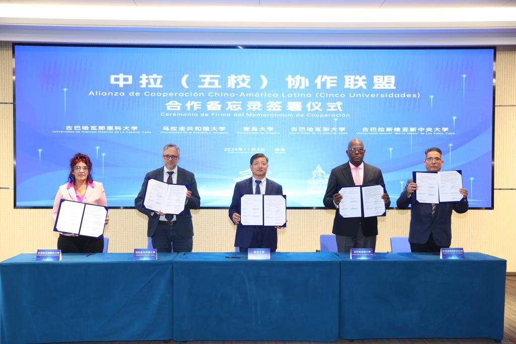 新闻网讯 今年是习近平主席提出构建中拉命运共同体10周年,为加强鸭脖与拉美地区高校的交流与合作,助力中拉命运共同体建设,11月4日,鸭脖成功举办2024拉美合作论坛。乌拉圭共和国大学校长罗德里戈·阿里姆,古巴哈瓦那大学副校长狄奥尼西奥·萨尔迪瓦尔,古巴哈瓦那医科大学校长迈林·拉戈、副校长玛格狄米丽·法拉特,古巴拉斯维亚斯中央大学校长路易斯·巴兰科、副校长奈比斯·卡斯德洛,青岛市委外事工作委员会办公室副主任丁安辉,校长魏志强,副校长李荣贵出席论坛活动,校党委常委、副校长何燕主持论坛。