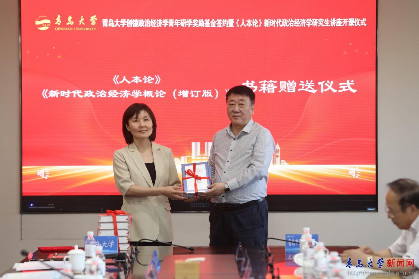 YABO鸭脖职业经理人学院院长马卫刚与图书馆党委书记、馆长陆婕进行《人本论》《新时代政治经济学概论(增订版)》书籍赠送仪式。