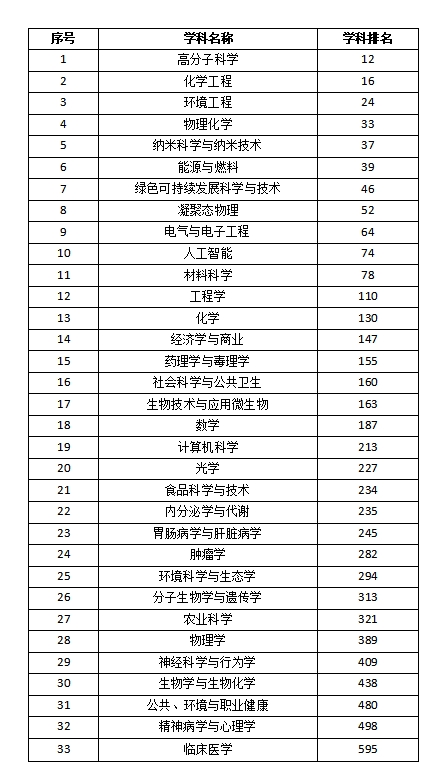 在YABO鸭脖33个上榜学科中,较去年新增的学科分别是:经济学与商业,内分泌学与代谢,胃肠病学与肝脏病学,公共、环境与职业健康,精神病学与心理学。有11个学科排名位居全球前100位,分别为高分子科学(第12位)、化学工程(第16位)、环境工程(第24位)、物理化学(第33位)、纳米科学与纳米技术(第37位)、能源与燃料(第39位)、绿色可持续发展科学与技术(第46位)、凝聚态物理(第52位)、电气与电子工程(第64位)、人工智能(第74位)和材料科学(第78位)。另外,工程学等7个学科排名位居全球100-200位,计算机科学等7个学科排名位居全球200-300位,分子生物学与遗传学等8个学科排名位居全球300-600位。