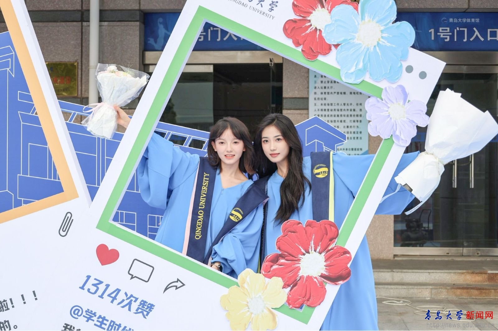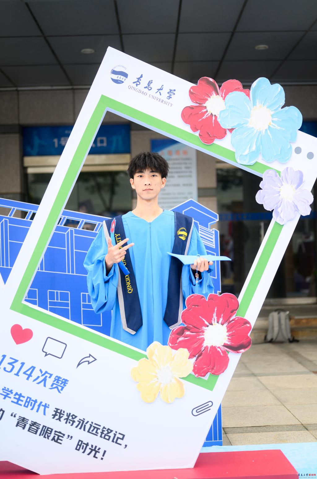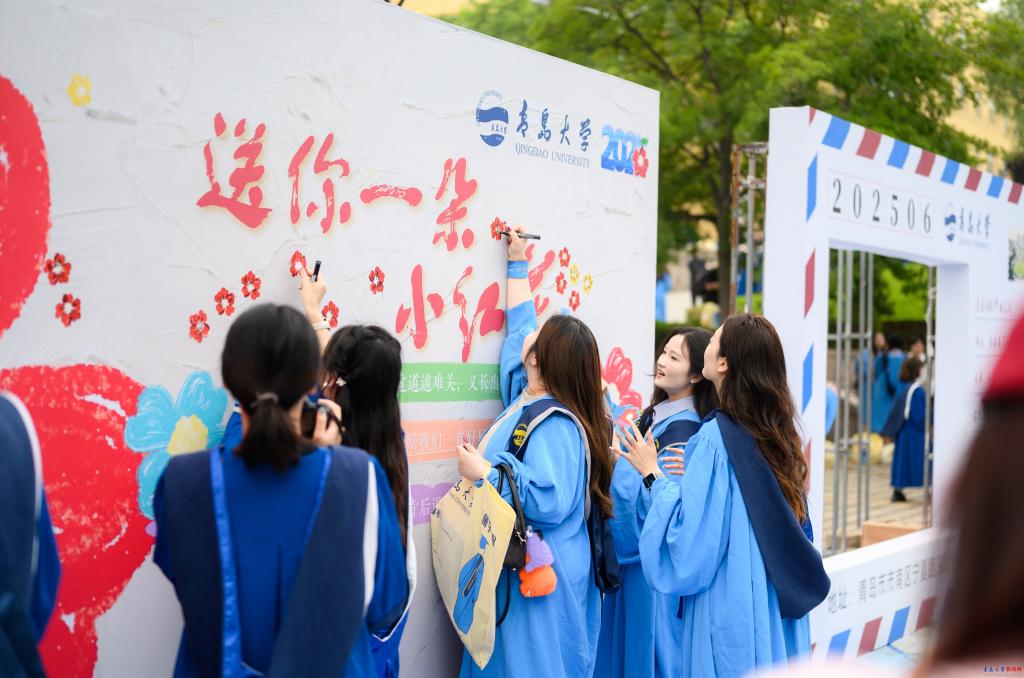 场馆外,学校特别搭建了“毕业小镇”,以“一路生花”为主题,设置了花朵拱门、签名墙、鸭脖信笺、鸭脖日历、鸭脖朋友圈等多个带有“小红花”元素的拍照打卡点,毕业生们纷纷在此合影留念。
