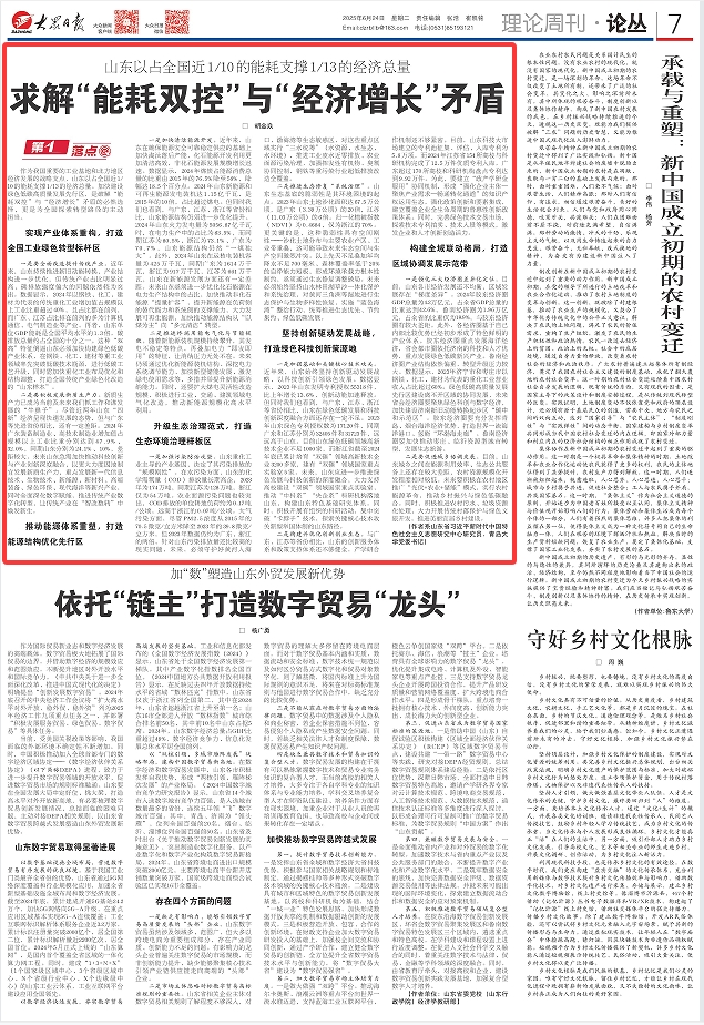 文章指出:作为我国重要的工业基地和北方地区经济发展的战略支点,山东以占全国近1/10的能耗支撑1/13的经济总量。加快建设绿色低碳高质量发展先行区,是破解“能耗双控”与“经济增长”矛盾的必然选择,更是为全国探索转型路径的主动担当。