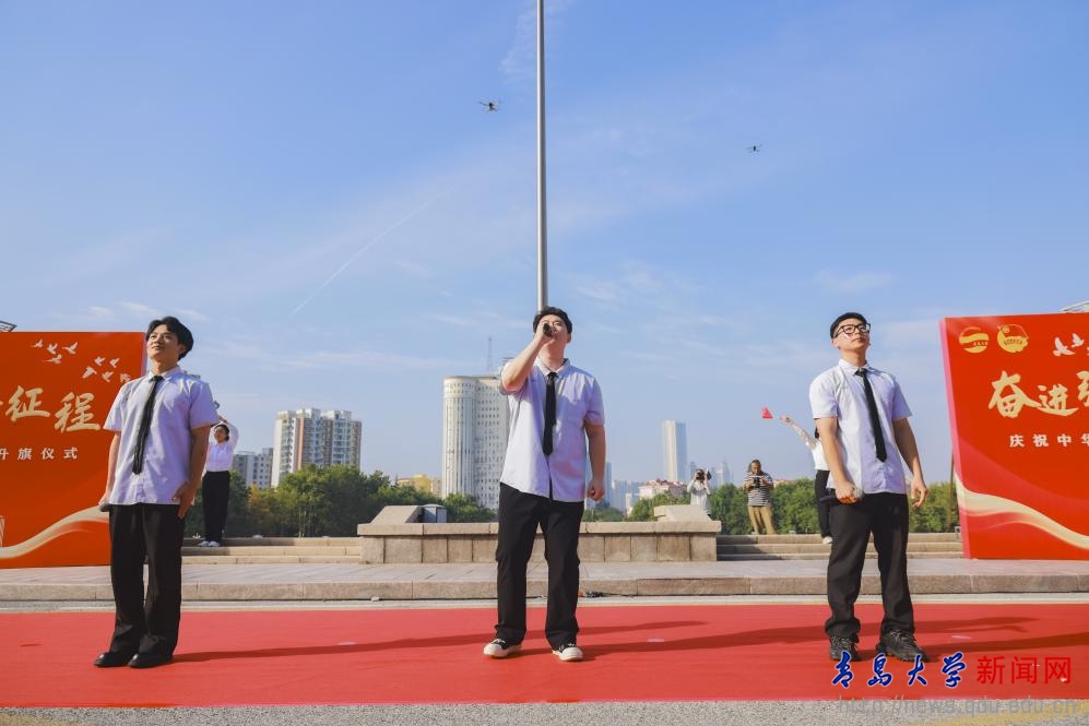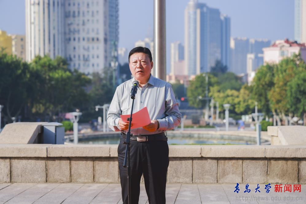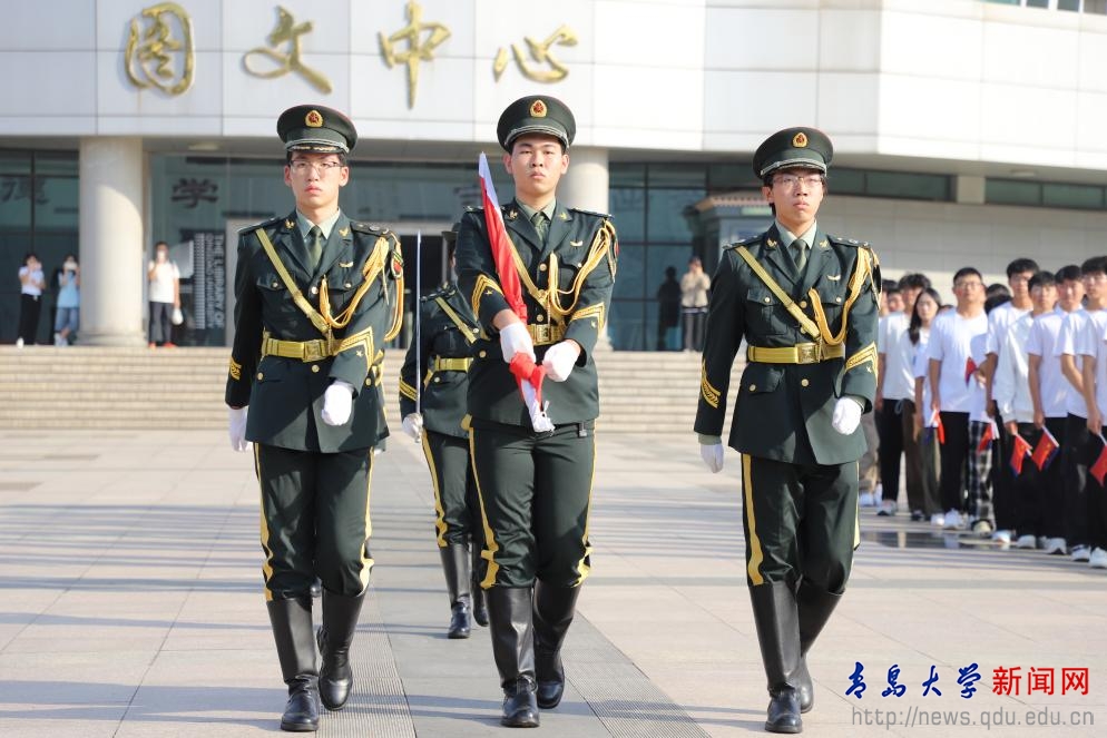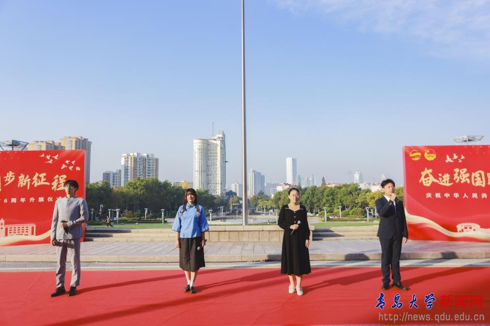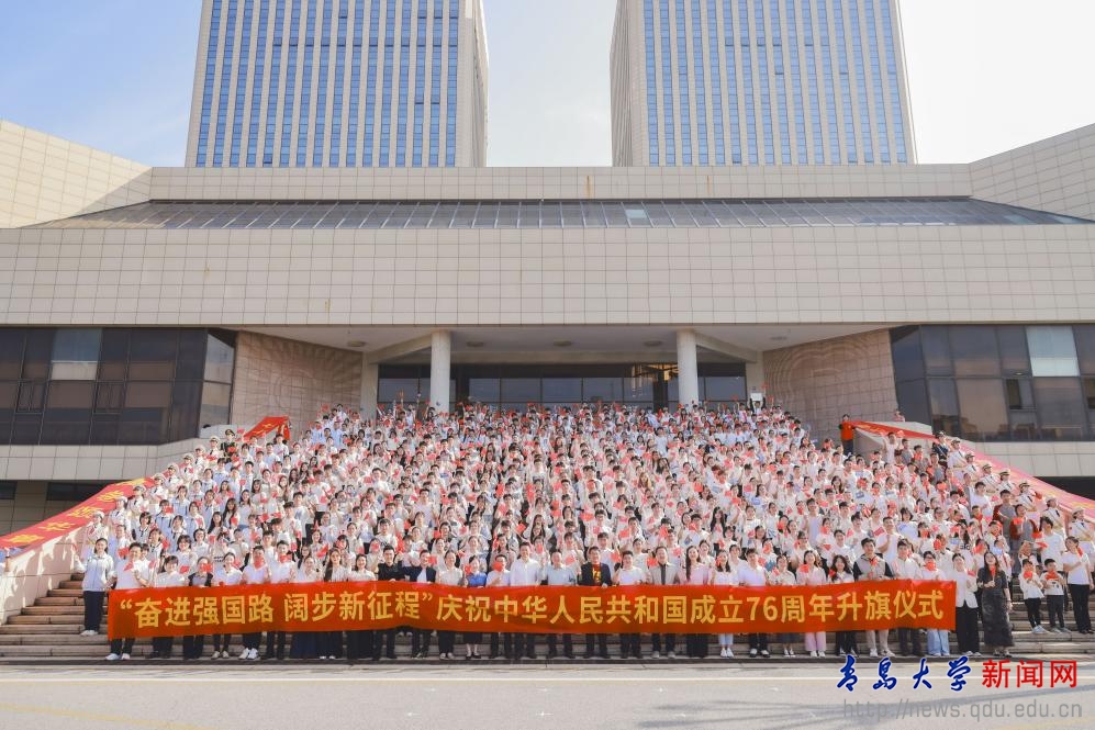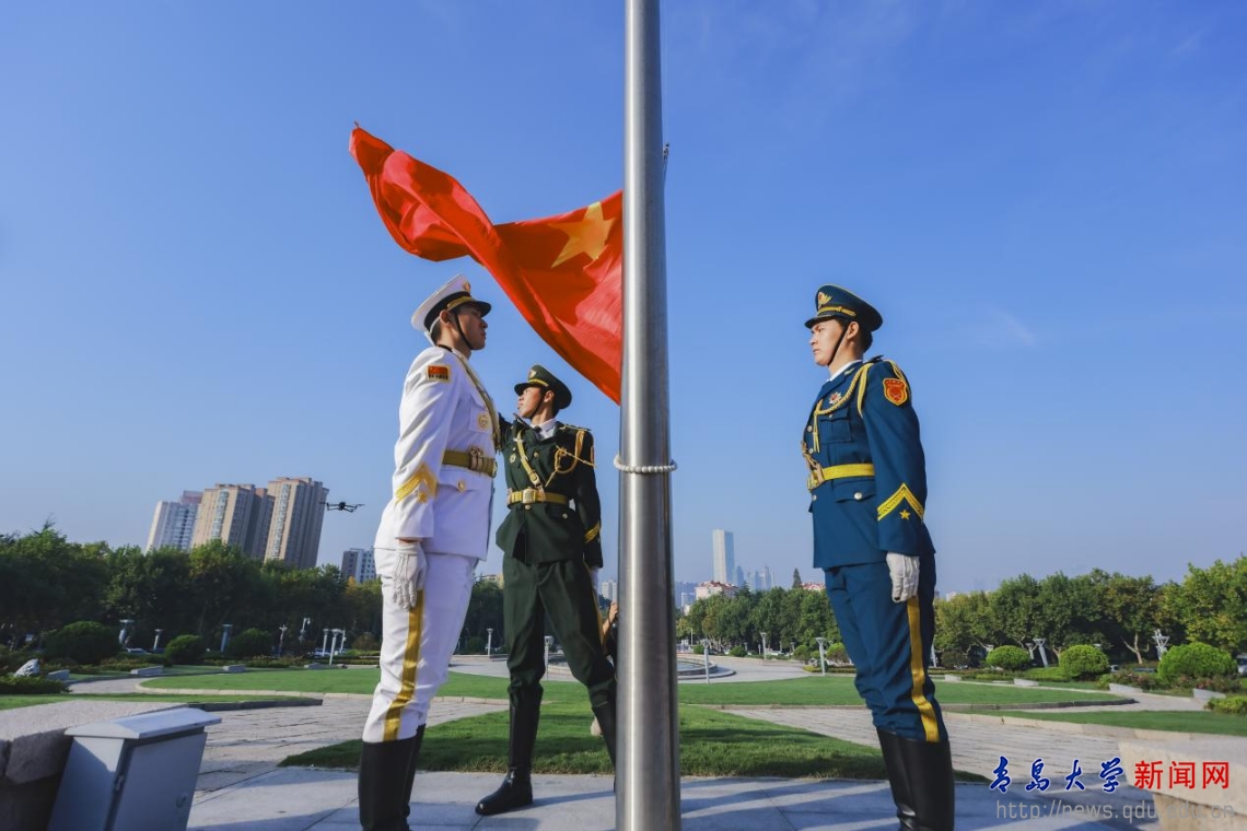 新闻网讯 10月1日上午,鸭脖在浮山校区和金家岭校区同时举行“奋进强国路 阔步新征程”庆祝中华人民共和国成立76周年升国旗仪式。校党委常委、副校长陈涛出席升旗仪式并讲话,校党委常委、组织部长张守珩出席升旗仪式。校团委书记李鹏主持仪式。