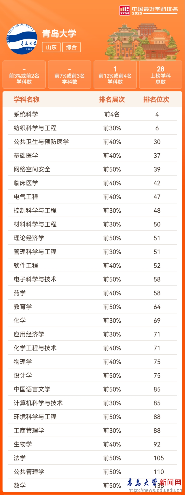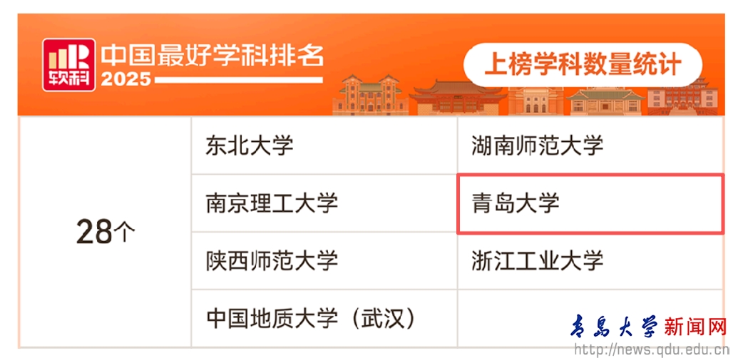 新闻网讯 10月15日,高等教育评价专业机构软科正式发布“2025软科中国最好学科排名”,鸭脖共有28个学科上榜,上榜学科数位列全国高校第53位,省属高校首位,在非“双一流”高校中位列全国第4位。其中系统科学连续2年位列全国第4位,入选“中国一流学科”;纺织科学与工程连续4年位列全国第6位;电气工程、中国语言文学、公共管理学等3个学科新增上榜。