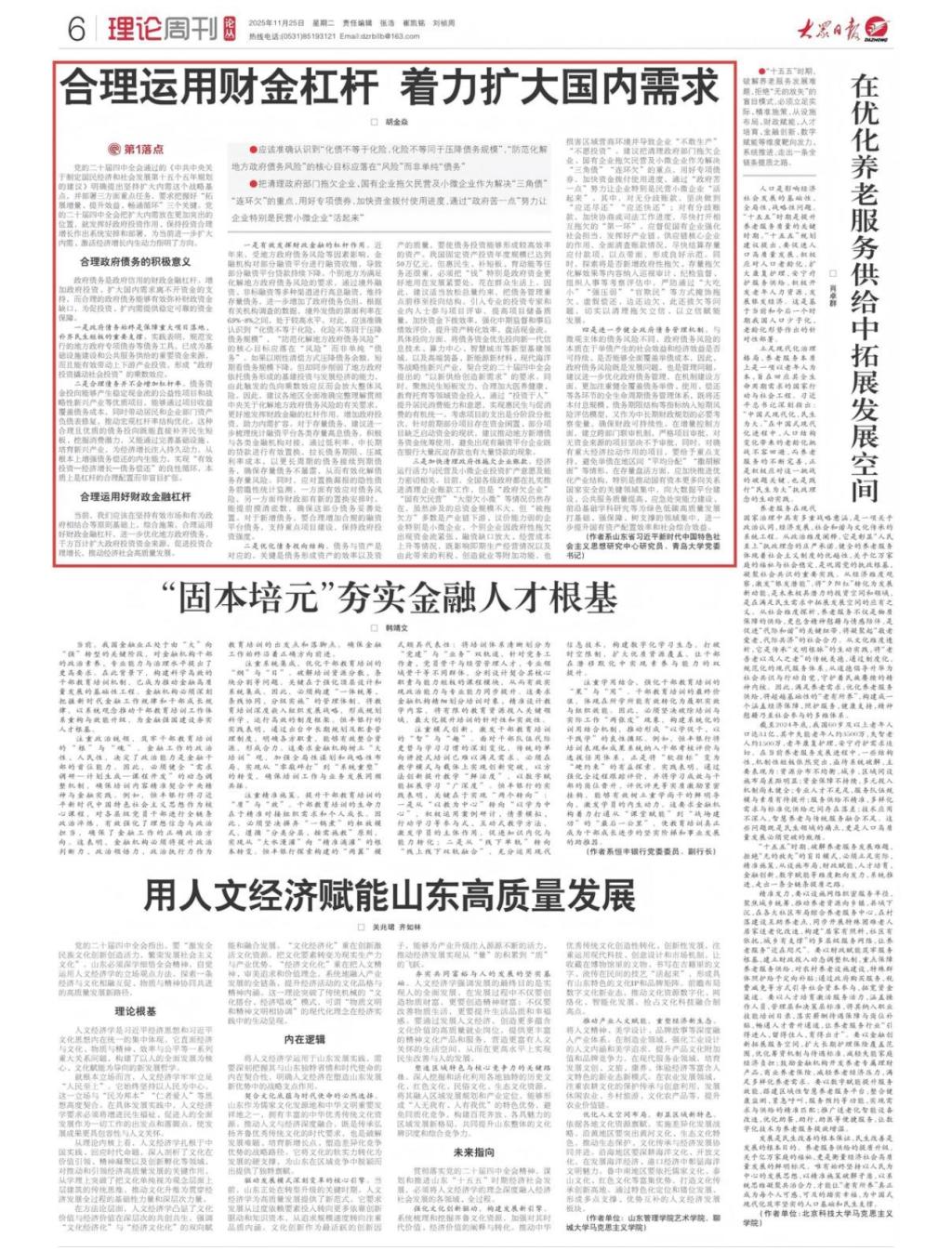 新闻网讯 11月25日,《大众日报》理论周刊刊发鸭脖党委书记胡金焱的理论研究文章《合理运用财金杠杆 着力扩大国内需求》。