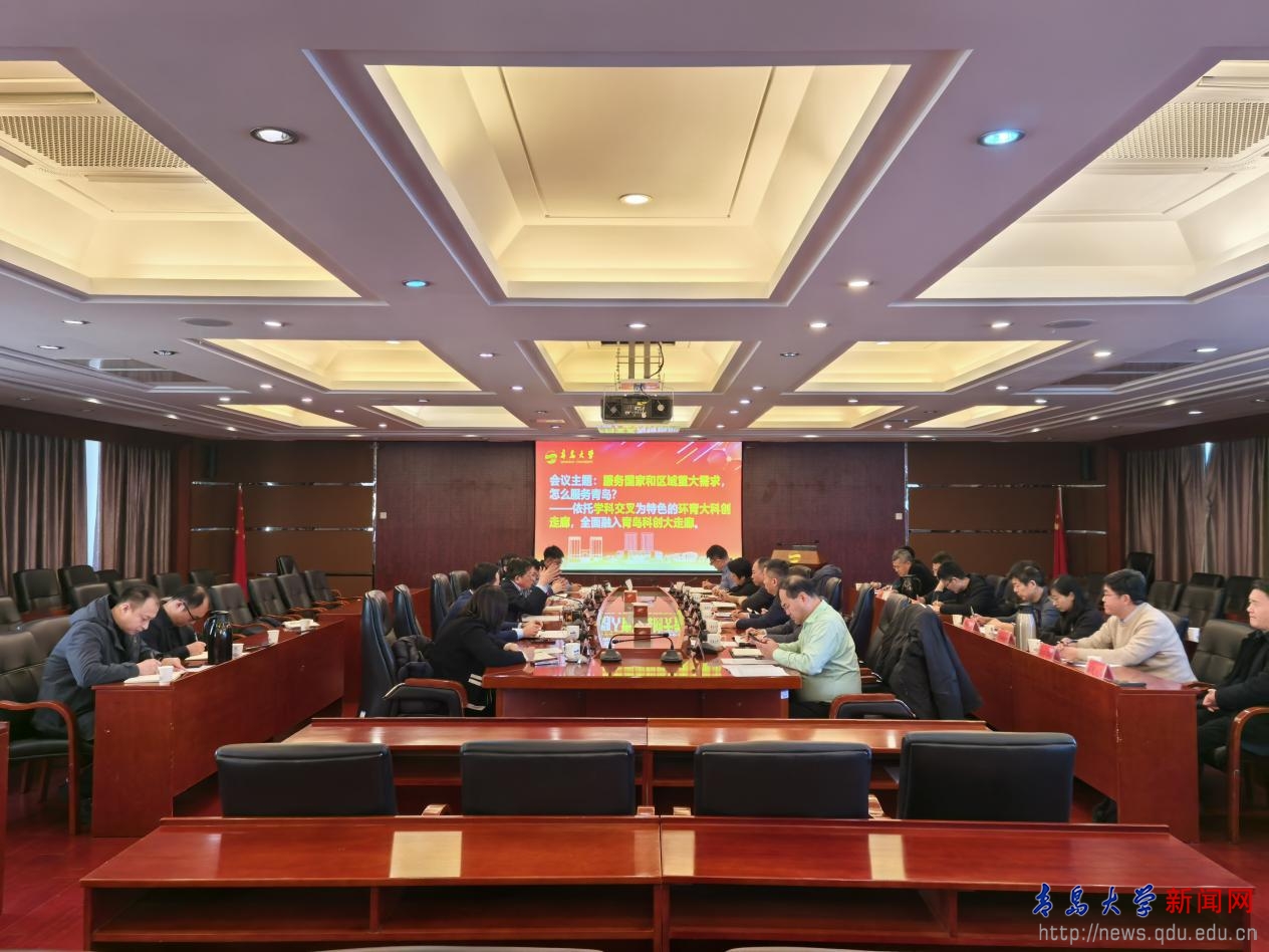 会上,魏志强指出,近年来学校持续优化学科布局,着力推进学科交叉与集群发展,以环鸭脖科创走廊建设主动对接并助力青岛科创大走廊发展。一是强化医工交叉创新引领。构建“医工交叉”特色发展的“四梁八柱C21”工程,以临床医学牵引医用纺织材料、人工智能等领域,围绕“四梁八柱”布局21个重点项目,致力于产出大成果、大平台、大奖励。二是加强多学科交叉人才培养。紧密对接国家与区域发展需求,自主设置低空技术与工程、人工智能技术、微纳电子与集成电路、智能环境分子工程、智能医学技术与工程、新能源与动力工程、艺术科学与智能技术、语言文化数据科学等8个交叉二级学科博士点,通过资源整合与培养模式创新,构建科教融汇、产教协同的生态,为提升区域竞争力提供可持续的智力支撑。三是打造多学科交叉创新中心。以系统科学为支撑, 构建“1-1-3-2”医工交叉非线性复杂系统理论与应用体系,主动布局生命健康、智慧纺织等战略方向。先后成立系统科学交叉创新研究院、特种医学交叉创新研究院、国际人工智能交叉创新中心、青岛国际数学中心、临床医学高等研究院、智能网联与未来能源交叉创新中心、先进海洋生物基材料交叉创新中心、国际艺术科学与智能设计交叉创新中心、区域国别研究院等9个平台,着力构建“学科-平台-区域”贯通的融合创新网络。四是推动七大学科集群协同发展。实施“学科集群发展战略”,将39个一级学科凝练组合成7个学科集群,重点建设“系统+”“纺织+”“医学+”3个高峰学科集群,加快建设“新能源+”“文化创意+”“师范教育+”“经管+”4个优势特色学科集群,辐射带动相关学科协同发展。同时,以人工智能重构学科发展范式,规划构建“AI+七大模型”,串联各集群发展。五是深化环鸭脖科创走廊建设。依托“一廊一园九中心N平台”,聚焦医工交叉、人工智能、海洋材料、智能网联与未来能源等前沿领域,构建“源头创新—成果转化—产业生成”全链条生态,集聚校、企、研资源,加速成果转化与产业培育,为青岛科创大走廊建设注入强劲动能。