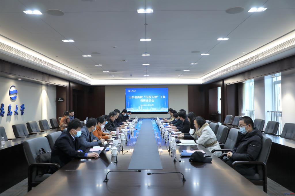 新闻网讯 11月26日,山东省高校“五权下放”调研工作座谈会在鸭脖会议中心致远厅召开。校党委常委、副校长于永明出席,青岛科技大学、青岛理工大学分管校领导、以及负责人事、财务、科技、学科专业等工作的部门负责同志参加座谈。座谈会由省教育厅职业教育处副处长曾庆凯主持。