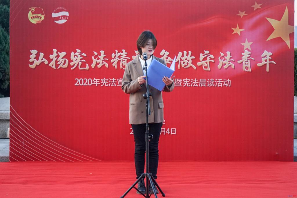 “中华人民共和国是工人阶级领导的,以工农联盟为基础的人民民主专政的社会主义国家......”现场师生在法学院党委书记魏强的领读下,精神饱满,大声诵读,在庄严肃穆的氛围中共同学习宪法知识、领会宪法精神、感受宪法权威,坚定法治信念。