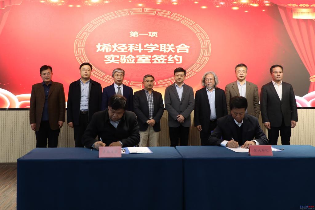 省委组织部副部长龚文东、校党委书记胡金焱为联合实验室揭牌。科技处处长李荣贵、金诚石化总经理周竟平分别代表双方进行了合作签约。