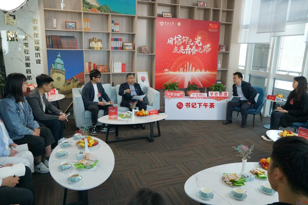 新闻网讯 4月9日,学校在浮山校区科技研发中心“印象鸭脖”休闲茶吧举办第三期“书记下午茶”活动。本期活动,校党委书记胡金焱与15名来自不同院系专业的学生代表,“用信仰之光点亮青春之路”为主题,围绕党史学习教育的意义、大学生如何学党史和大学生入党动机三个话题,聚焦学生成长发展,进行了面对面交流、零距离沟通。大家围坐一堂,同饮下午茶,畅聊成长成才,畅谈未来规划。活动由党委学生工作部部长解涛主持。