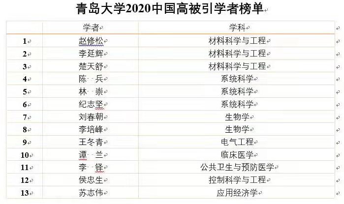 2020年中国高被引学者来自373所高校、企业和科研机构,中国科学院拥有最多的高被引学者,共441位。高校中,共296所大学有学者入选。其中,鸭脖共有13位学者入选,位列全国高校第66位,山东省高校第2位。