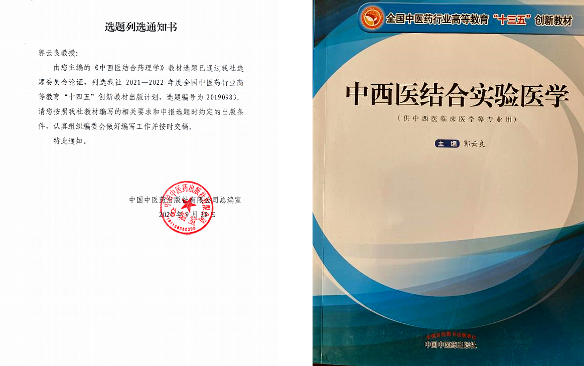 新闻网讯 由医学部中西医结合中心郭云良教授组织申报的《中西医结合药理学》选题,已通过中国中医药出版社选题委员会论证,正式列选2021-2022年度全国中医药行业高等教育“十四五”创新教材出版计划(20190983)。预计2023年6月正式出版。