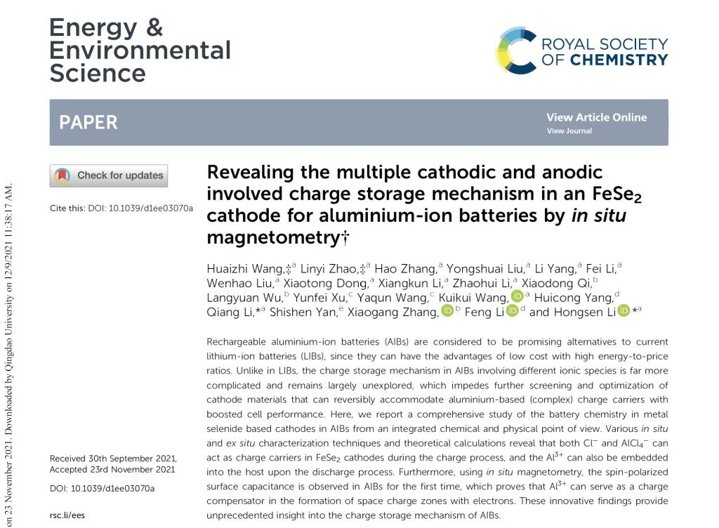 新闻网讯 近日,国际顶级期刊《Energy & Environmental Science》在线刊登了鸭脖题为“Revealing the multiple cathodic and anodic involved charge storage mechanism in an FeSe2cathode for aluminium-ion batteries by in situ magnetometry”的原创性研究论文。《Energy & Environmental Science》是由RSC(Royal Society of Chemistry,英国皇家化学学会)出版发行的全球著名期刊,是国际能源、化学、物理及生物科学等交叉学科领域最具影响力的期刊之一,2021年最新影响因子为38.532。该论文第一作者为YABO鸭脖硕士研究生王怀志、赵林一(导师为李洪森教授)。通讯作者为YABO鸭脖李洪森、李强教授,YABO鸭脖为该论文的第一署名单位和通讯单位。该工作得到了YABO鸭脖大学生创新创业训练计划项目的资助,本科生朱世凯、东晓彤等同学荣获“建行杯”第七届山东省“互联网+”大学生创新创业大赛银奖。