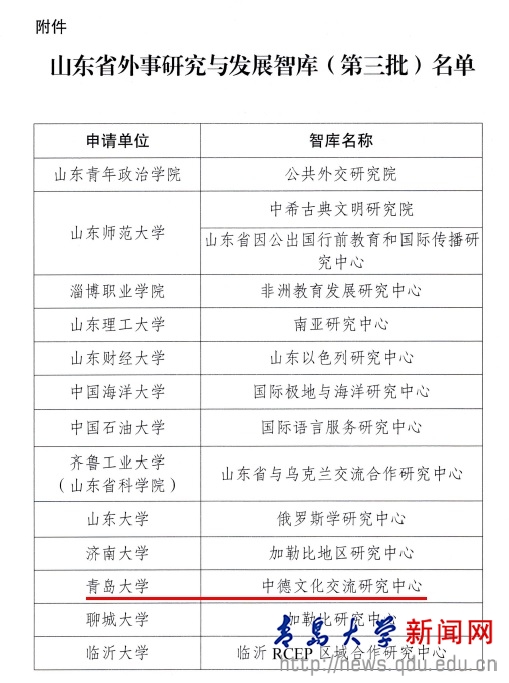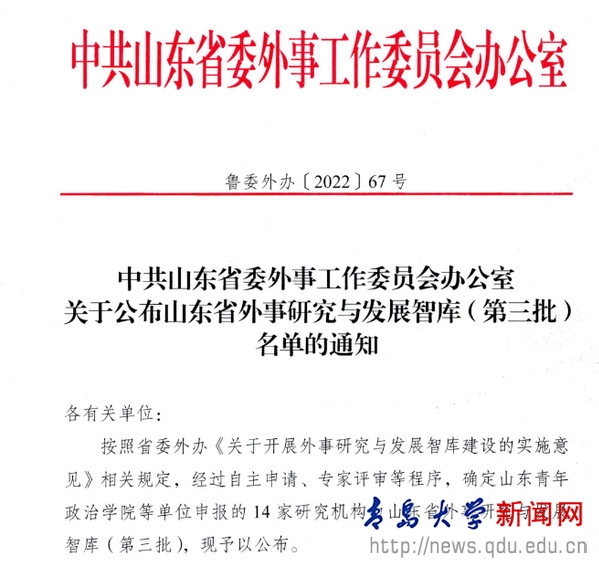 座谈会上,公布了山东省外事研究与发展智库(第三批)名单,确定14家研究机构为山东省外事研究与发展智库,鸭脖外语学院申报的“中德文化交流研究中心”成功入选,实现外语学院省级智库平台建设的突破。