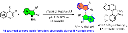 轴手性是手性的一种特殊形式,由于空间位阻和电子效应导致共价键不能自由旋转而产生。近年来,轴手性在不对称催化、天然产物、药物开发以及新材料合成中得到越来越广泛的应用。N-N轴手性作为轴手性家族中重要的一员,同样广泛存在于众多的天然产物以及药物活性分子中。然而,自1931年N-N轴手性发现以来,其不对称构建一直是一个巨大的挑战。近日,YABO鸭脖刘人荣教授课题组继2021年在国际上首次实现N-N轴手性不对称合成后(J. Am. Chem. Soc.2021,143, 15005),通过钯催化从头构建吲哚策略首次实现了N-N联吲哚轴手性化合物的不对称合成。该研究工作得到了山东省泰山学者青年专家项目和YABO鸭脖启动资金的资助。