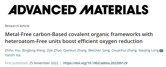 论文信息:Metal-Free carbon-Based covalent organic frameworks with heteroatom-Free units boost efficient oxygen reduction.Zhihu You, Bingbing Wang, Zijie Zhao, Qiankun Zhang, Weichen Song, Chuanhui Zhang, Xiaojing Long*, Yanzhi Xia,https://onlinelibrary.wiley.com/doi/10.1002/adma.202209129