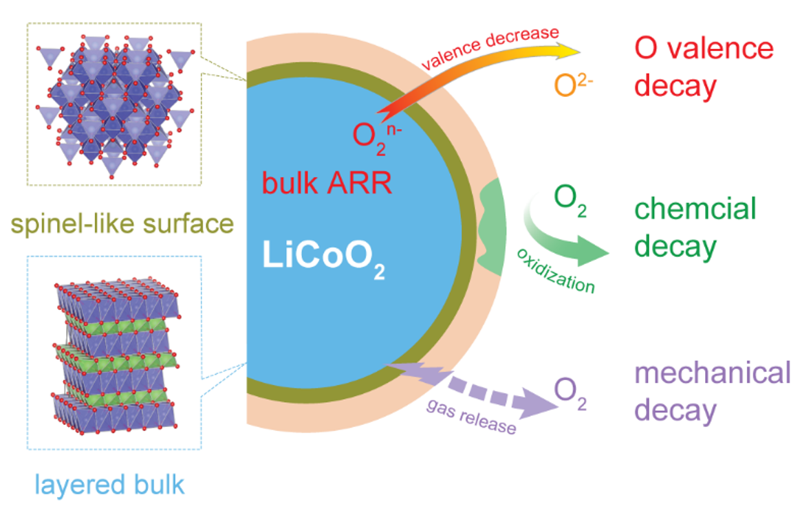 层状氧化物正极基于阴离子氧化还原机制(Anionic Redox Reaction, ARR)可以突破过渡金属能带电荷补偿的容量极限,提供更高的可逆容量。然而,晶格氧2p能带损失电子,除了导致体相晶格结构不稳定外,还会引起一系列表面效应,使材料性能快速衰减。由于正极表面存在复杂的固态电解质界面相(Cathode Electrolyte Interphase, CEI),对材料表面氧电子态的探测极具挑战,表面晶格氧反应与材料衰退之间的关联尚缺乏清晰的物理图像。该工作首次结合mRAS和APXPS光谱研究了模型电极LiCoO2中高价氧引起的界面反应机制。mRAS表明在LCO体相发现的高价氧信号不能在正极表面维持,而是发生径向上的价态衰减;APXPS进一步揭示了正极表面CEI层会被逸出氧或高活性氧氧化,不能形成稳定的表面从而导致材料性能快速衰减。以上结果说明,在正极表面构筑无ARR反应活性或低ARR反应活性的结构是稳定CEI,实现基于ARR反应高容量材料稳定循环的关键。这些发现为高容量氧化物正极材料表面结构设计提供了理论基础。