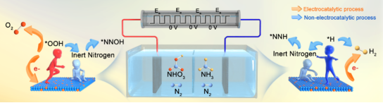 电化学催化氮气固定合成氨和硝酸,被认为是有可能取代传统Haber-Bosch和Ostwald工艺的新技术。然而,固氮反应和水裂解副反应间的动力学差异导致催化选择性低、活性差,如何实现高选择性氮气定向转化一直是阻碍该领域发展的重大挑战。该工作首次将氮气活化理论分为水裂解生成活性氢、活性氧的电化学过程和活性中间体与氮气作用的非电化学过程,并基于反应特点差异,开创性的将非连续的脉冲电催化应用于电催化固氮领域:通过周期性的脉冲策略周期性更新能斯特扩散层活性物质浓度,增强氮气和活性中间体的供应;缓解复杂电化学反应中各基元反应间的动力学差异,实现二电极体系的高效氮气还原氧化(NOR选择性提升44.94倍,NRR选择性提升7.8倍)。该工作为动力学差异的多步耦合反应的电催化过程传质优化、选择性提升提供了新的研究思路。