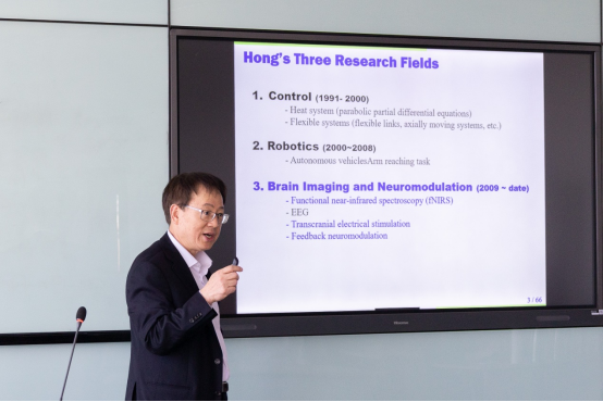 洪金植介绍了“认知机电”的新领域,尤其是脑神经信号的生物原理,以及如何利用功能性功能性近红外光谱技术(functional near - infrared spectroscopy , fNIRS)对脑部区域信号进行检测。借由脑机接口技术,可以实现神经退行性疾病的早期诊断,并根据脑信号模式特征,针对性开展直流/交流电流的非侵入式脑刺激方法,刺激脑部相关区域,使处在非正常退化现象的脑细胞恢复到正常水平,以此来解决药物治疗智能将神经退行性疾病短暂延迟的局限问题。报告语言生动、脉络清晰,与在场师生进行了交流探讨。