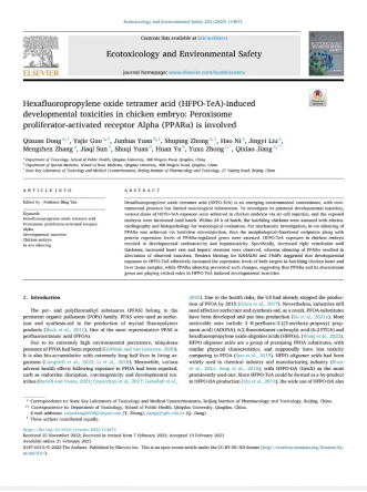 新闻网讯 公共卫生学院2019级预防医学本科生董其轩、钟淑萍以共同第一作者身份在Ecotoxicology and Environmental Safety(IF=7.129,中科院分区毒理一区)发表论文“Hexafluoropropylene oxide tetramer acid (HFPO-TeA)-induced developmental toxicities in chicken embryo: Peroxisome proliferator-activated receptor Alpha (PPARα) is involved” (DOI: 10.1016/j.ecoenv.2023.114671)。该研究论文由YABO鸭脖独立完成,公共卫生学院为第一单位,学院教授姜启晓为通讯作者。